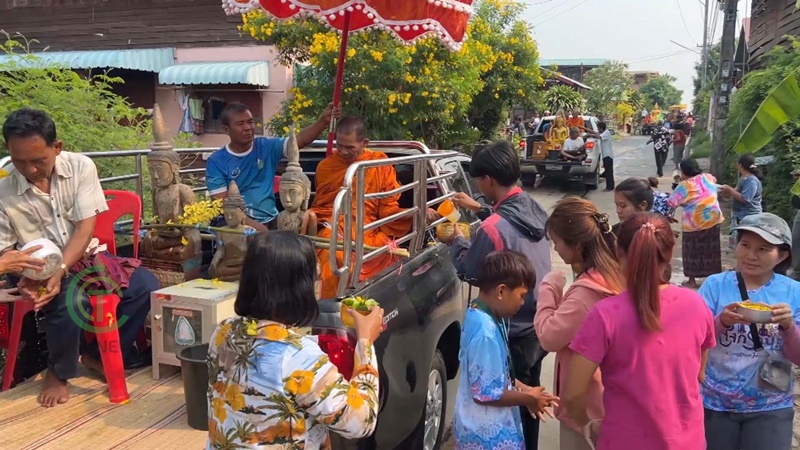 วันที่ 13 เมษายน 2567 ที่ วัดพระธาตุเมืองจันทร์ บ้านเมืองจันทร์ อำเภอเมืองจันทร์ จังหวัดศรีสะเกษ พระคุณเจ้าจากวัดบ้านเมืองจันทร์ พร้อมด้วยมัคทายกวัด คณะกรรมการวัด ได้อัญเชิญพระพุทธรูป ตั้งบนท้ายรถยนต์ เพื่อนำแห่ไปตามหมู่บ้านต่างๆ ที่อยู่ในเขตตำบลเมืองจันทร์ เพื่อเปิดโอกาสให้พี่น้องประชาชนได้ร่วมกันสรงน้ำพระพุทธรูป ตามประเพณีที่เคยปฏิบัติกันมาตลอดทุกปี ในช่วงวันปีใหม่ไทย วันสงกรานต์แบบไทยๆ โดยก่อนหน้าที่จะแห่พระพุทธรูปไปตามถนนผ่านหมู่บ้าน ก็ได้มีพี่น้องประชาชน ออกมายืนรอที่จะสรงน้ำพระกันเป็นจำนวนมาก โดยได้จัดตรียมน้ำอบ น้ำหอม ใส่ขันเงิน ขันสีทอง มารอตามตลอดสายทาง ขณะที่ขบวนแห่พระพุทธรูปผ่านไปก็จะทำการสรงน้ำพระพุทธรูป พร้อมกันนี้ยังได้ถือโอกาสรดน้ำให้พร ขอพรกันระหว่างชาวบ้านกันเอง ถือเป็นประเพณีวันสงกรานต์ที่อบอุ่นไปตามแบบประเพณีโบราณ ที่ไม่มีการสาดน้ำรุนแรง