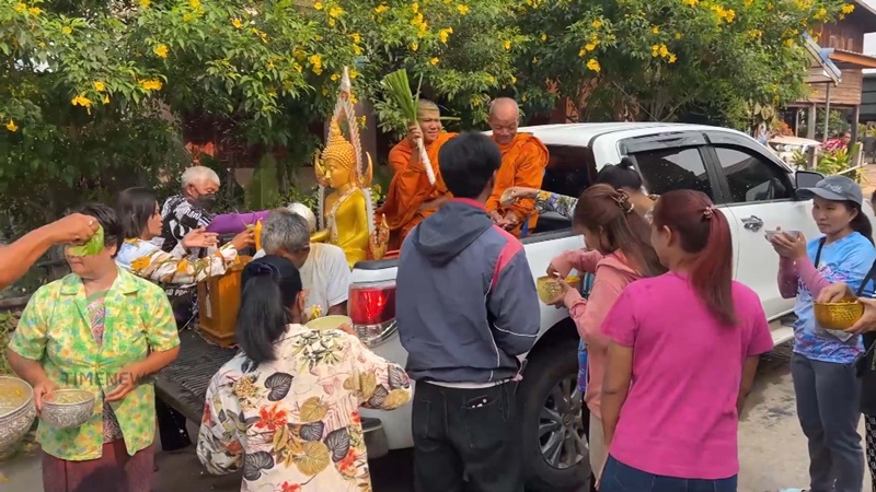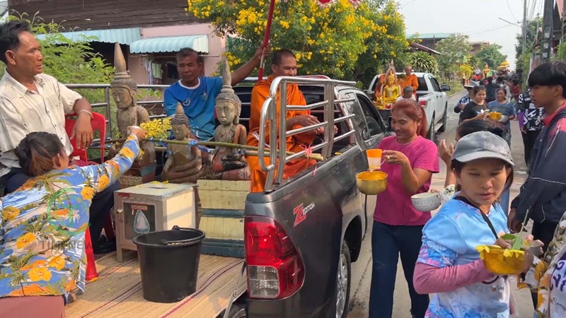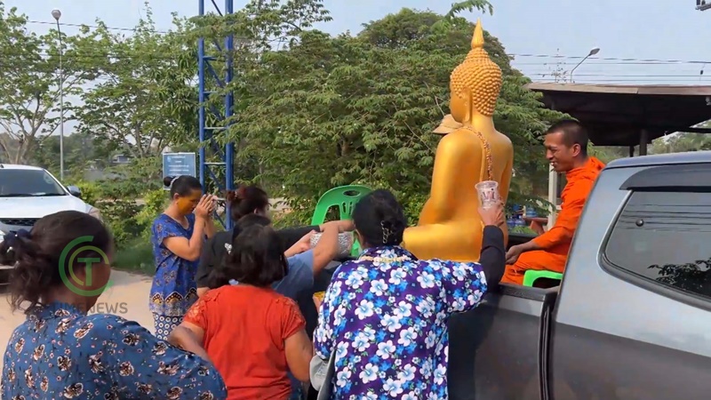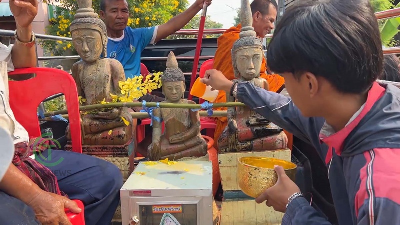 ชาวบ้านในอำเภอเมืองจันทร์ จังหวัดศรีสะเกษ แห่ร่วมสรงน้ำพระไม้โบราณ ที่พระคุณเจ้านำลงมาจากอุโบสถปีละครั้งในช่วงเทศกาลวันสงกรานต์ โดยคณะสงค์ทางวัด จะนำพระใส่รถยนต์ตระเวนไปตามหมู่บ้านให้สรงน้ำ