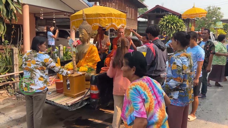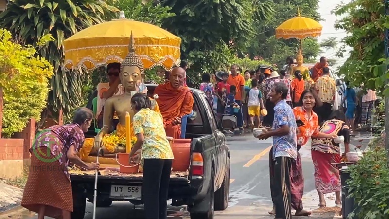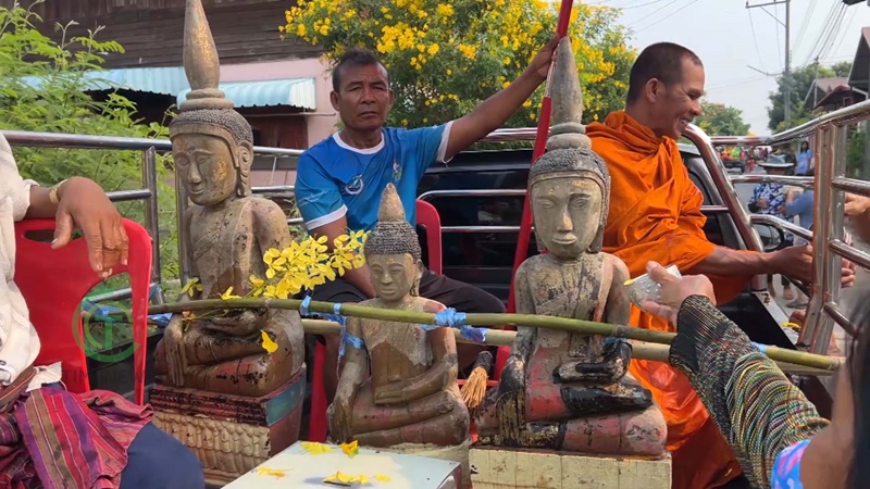 และที่สำคัญ คณะกรรมการวัดพระธาตุเมืองจันทร์ นอกจากนั้นคณะกรรมการวัด ยังได้อัญเชิญพระพุทธรูปไม้โบราณ ลงมาจากโบสถ์เพื่อนำรถยนต์แห่ไปพร้อมขบวนนี้ด้วย ถึง 3 องค์ แห่ไปให้พี่น้องประชาชนได้สรงน้ำ ขอพรเพื่อความเป็นสิริมงคลแด่ตนเอง และครอบครัวด้วย นับเป็นเรื่องที่ดี ก่อนที่ชาวบ้านจะได้ติดตามขบวนเข้าไปที่วัด เพื่อทำบุญ ถวายภัตรหารเพล ทำบุญก่อเจดีย์ทราย หรือทำบุญรวมญาติกันตามประเพณีของชาวบ้านเมืองจันทร์ต่อไปในช่วงสายๆ ด้วย
