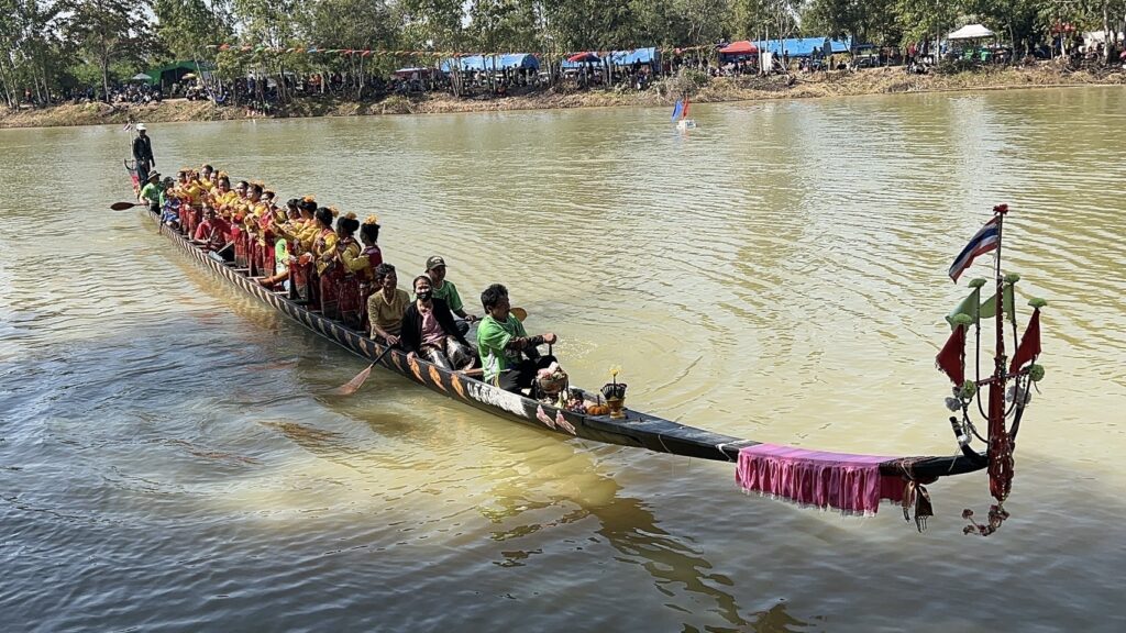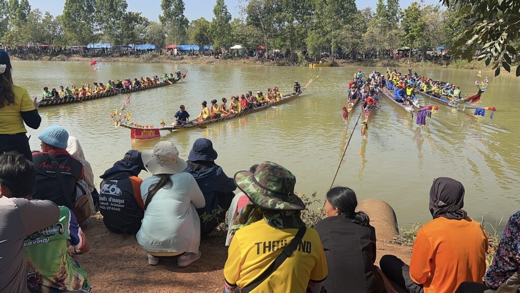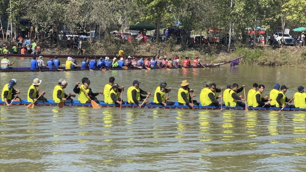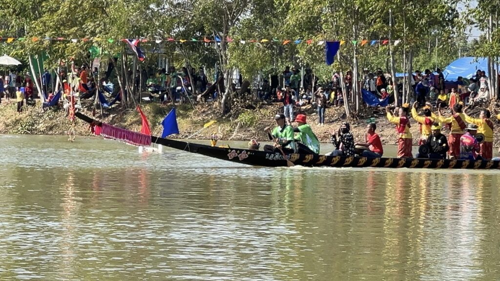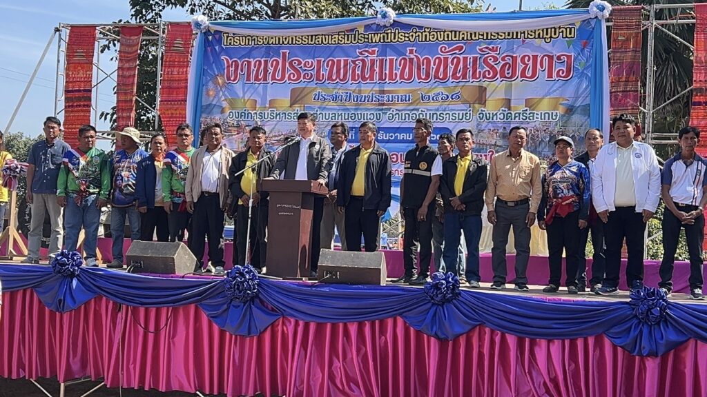 วันที่ 22 ธันวาคม 2567 ที่ อ่างเก็บน้ำ ร่องน้ำคำ บ้านแสงใหญ่ ตำบลหนองแวง อำเภอกันทรารมย์ จังหวัดศรีสะเกษ ชาวบ้านได้ร่วมกัน ให้การต้อนรับ นักท่องเที่ยวจากทั่วสารทิศ ที่เป็นแฟนพันธุ์แท้ในการแข่งขันเรือยาวโบราณ เพราะวันนี้ถือเป็นการแข่งขันเรือยาวสนามสุดท้าย ก่อนหยุดฤดูกาลแข่งเรือยาวของจังหวัดศรีสะเกษ ซึ่งวันนี้ถือเป็นการแข่งขันเรือยาว พิเศษ ที่จัดขึ้นเป็นประจำทุกปี โดยการจัดแข่งขันเรือยาวโบราณ ขนาด 30 – 40 ฝีพาย ที่เรือมีอายุ 157 ปี ที่เป็นตำนานของคุ้งน้ำในแถบภาคอีสาน นั้นก็คือ เรือท้าวผ่าน และเรือนางนาคแก้ว โดยเรือท้าวผ่าน เป็นเรือขุดโบราณ จากไม้ตะเคียนทั้งลำ ในช่วงปี พ.ศ.2410 สมัยขุนบริบาล เป็นกำนันตำบลหนองแวง ขุนศักดิ์ดา เป็นผู้ใหญ่บ้านแสงใหญ่ คนแรก มีมติให้มีแข่งพายเรือ เพื่อคัดเลือกเอามาใช้ประจำหมู่บ้าน ที่สมัยนั้นใช้การเดินทางโดยทางเรือ ตามลำน้ำมูล และลำน้ำชี ชาวบ้านจึงได้เดินทางไปซื้อมาจาก อำเภอโขงเจียม เมื่อปี พ.ศ.2430 ซึ่งเรือขุดท้าวผ่าน ได้มีการขุดเป็นเรือสำเร็จไว้แล้วตั้งแต่ปี พ.ศ.2410 ส่วนเรือนางนาคแก้ว เป็นเรือที่ขุดจากต้นตะเคียนทั้งต้นเช่นกัน โดยเรือขุดอยู่ที่ บ้านท่าลาด อำเภอเสลภูมิ จังหวัดร้อยเอ็ด ขุดเสร็จเมื่อปี พ.ศ.2440 โดยหลวงพ่อจารย์ครูศรี ภาดี เป็นเจ้าอาวาสวัดบ้านแสงใหญ่ สมัยนั้น ได้เดินทางพร้อมมัคถายกวัด ไปซื้อมาในราคา 3,000.-บาท นำมาสร้างความสามัคคีให้กับชุมชน ที่ได้มาฝึกพายเรือ มาลงพายเรือ ไปร่วมแข่งขันหลายสนาม ได้รางวัล 1 – 3 มาโดยตลอด และมีการนำเรือมาบำรุง รักษา ให้คงสภาพที่สามารถใช้การได้ตราบจนทุกวันนี้ ซึ่งวันนี้เรือทั้ง 2 ลำ ที่ถือว่าเป็นเรือโบราณที่มีอายุมากที่สุด ได้มาลง ร่วมทำการแข่งขัน เรือยาวโบราณ 30 – 40 ฝีพายด้วย ซึ่งวันนี้มี นายสุรชาติ ชาญประดิษฐ์ ผู้แทนราษฏร เขต 2 จังหวัดศรีสะเกษ พรรคเพื่อไทย เดินทางมาเป็นประธานเปิดการแข่งขันด้วย