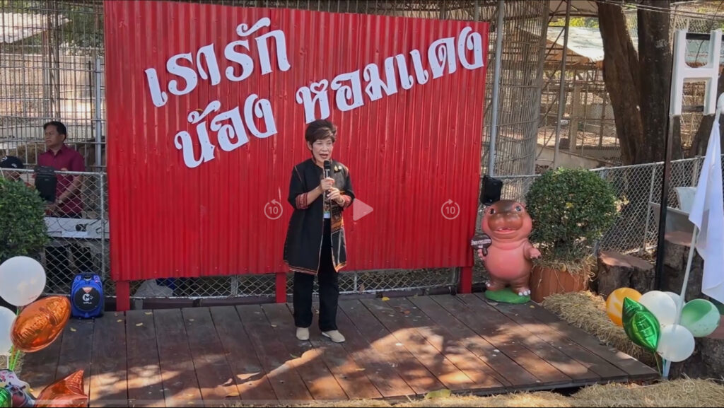 วันที่ 13 กุมภาพันธ์ 2568 ที่ ศูนย์อนุรักษ์พันธ์สัตว์ป่า สวนสัตว์ศรีสะเกษ ภายในสวนสมเด็จพระศรีนครินทร์ศรีสะเกษ สำนักงานสาธารณสุขจังหวัดศรีสะเกษ เจ้าภาพในการมอบเค้กวันเกิด ครบรอบ 4 เดือนให้กับน้องหอมแดง ลูกฮิปโปโปเตมัสเกิดใหม่ ที่กำลังน่ารัก อ้วนจ้ำหม้ำ ทุกวันจะมีนักท่องเที่ยว น้องๆ ที่ขอให้ผู้ปกครองพาเข้ามาชมความน่ารักของน้องหอมแดง โดยทางสวนสัตว์ได้เปิดให้เข้าชมได้ ตั้งแต่ เวลา 08.30 น. ไปจนถึงเวลา 17.30 น.ทุกวัน และยังเปิดโอกาสให้ทุกคน ได้ซื้อผลไม้มามอบให้น้องหอมแดงได้ด้วย ซึ่งวันนี้เป็นวันครบรอบวันคล้ายวันเกิดของน้องหอมแดง ที่เกิดเมื่อ วันที่ 13 ตุลาคม 2567 วันนี้ครบรอบ 4 เดือนพอดี ทางสำนักงานสาธารณะสุขจังหวัดศรีสะเกษ โดย นายแพทย์ ทนง วีระแสงพงษ์ สาธารณสุขจังหวัดศรีสะเกษ และคณะก็ได้นำเค้กผลไม้มามอบให้ 3 กระจาดขนาดใหญ่ โดยมี นางสาว ชนมณัฐ รอดบุญธรรม รองผู้ว่าราชการจังหวัดศรีสะเกษ เดินทางมาร่วมอวยพรวันเกิด และร่วมร้องเพลง แฮปปี้เบริดเดย์ให้กับน้องหอมแดง ด้วย
