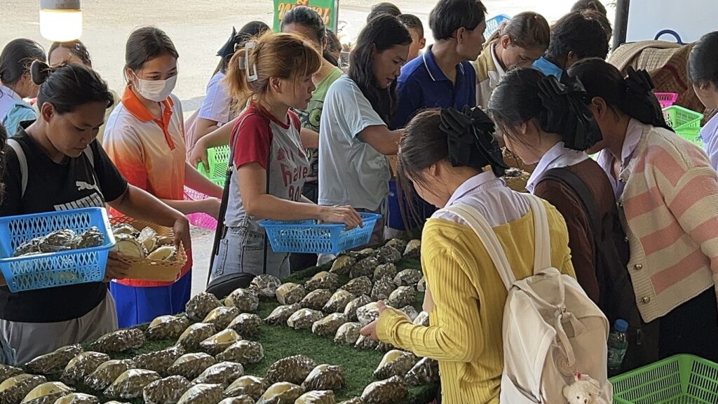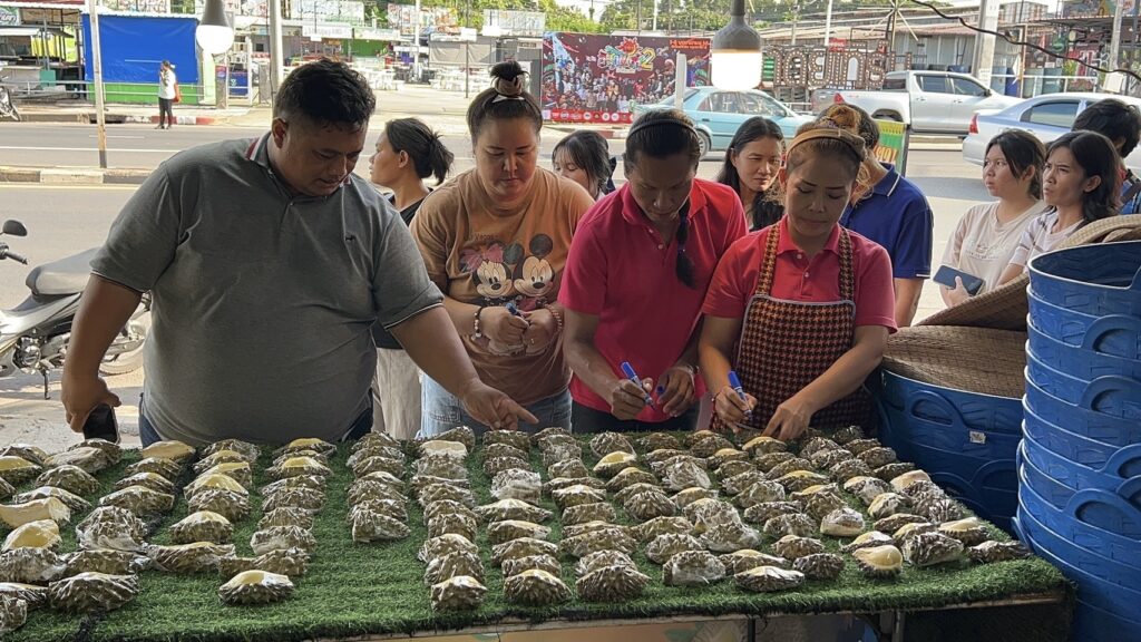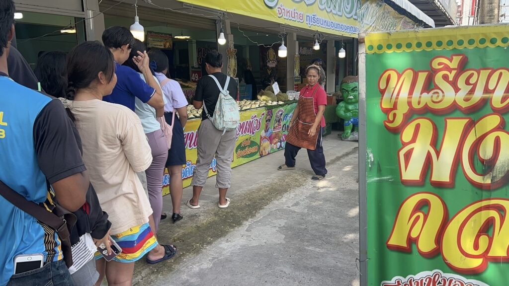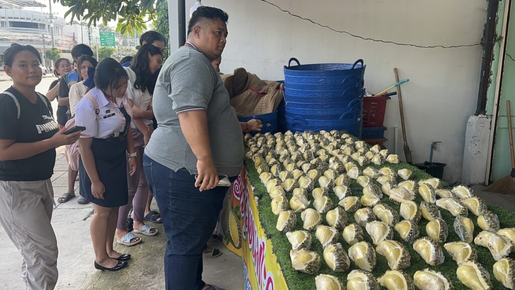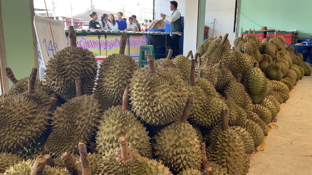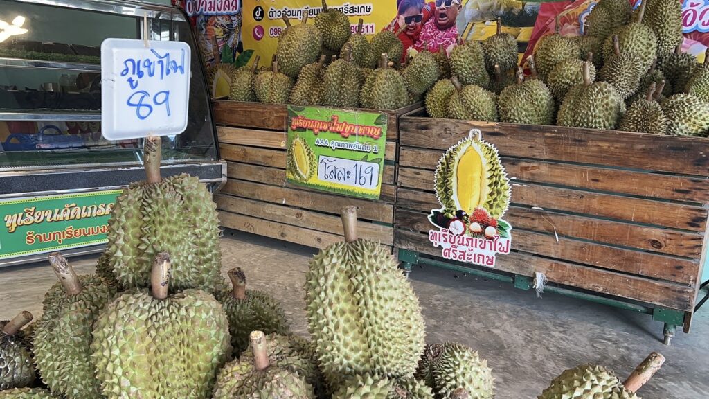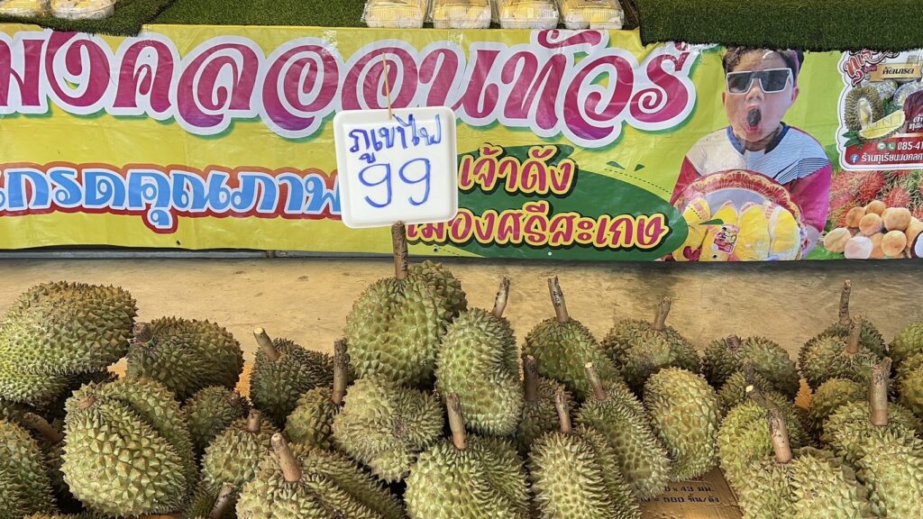 บ่ายของวันที่ 23 มิถุนายน 2568 ที่ ร้านทุเรียนมงคลศรีสะเกษ อำเภอเมือง จังหวัดศรีสะเกษ ซึ่งถือว่าเป็นร้านที่กระจายสินค้า ทุเรียนภูเขาไฟศรีสะเกษ ช่วยพี่น้องเกษตรกรมาโดยตลอด กับการนำกำไรมากระจายให้ผู้ที่มีงบน้อย แต่อยากทานทุเรียนภูเขาไฟศรีสะเกษ ซึ่งปกติจะจำหน่ายอยู่ที่ กิโลกรัมละ 150.-บาท ลูกหนึ่ง 2 – 3 กิโลกรัม ก็จะตกอยู่ที่ลูกล่ะ ราวๆ 450 – 500.-บาท แต่หากพ่อค้าไปรับซื้อแบบเหมาซื้อยกสวน แบบล้ง ก็จะได้ราคากิโลกรัมละ 89.-บาทในระยะนี้ จากช่วงต้นฤดูที่ทุเรียนภูเขาไฟออกสู่ตลาด จะขายกิโลกรัมละ 120 – 150.-บาท แต่จากการที่สถานการณ์การส่งออกผลไม้ไทย ผ่านไปกัมพูชา และส่งไปเวียดนาม สู่ประเทศจีน เริ่มพบปัญหา ประกอบกับเป็นช่วงที่ผลไม้ออกมาก ส่งผลให้ราคาตกลงมาบ้าง แต่ก็เป็นโอกาสของผู้บริโภค จะได้ทานทุเรียนดี มีคุณภาพ แต่ราคาถูกบ้าง