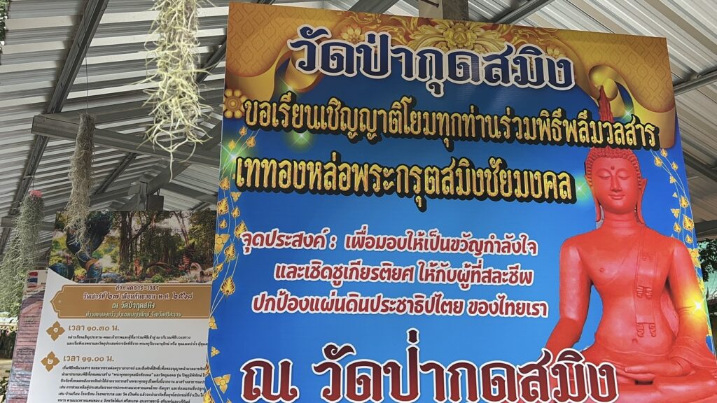 ขณะที่นายเมฆ ปวาโร ลูกศิษย์วัดกุดสมิง เปิดเผยว่า วันนี้ผมมาขอเชิญชวนพี่ๆ เพื่อนๆ มาเข้าร่วมพิธี ในวันที่ 27 กันยายน 2568 นี้ จะมีพิธีบวงสรวง ท้าวเวสสุวรรณ จะมีพี่น้ำ ระพีพัฒน์ มาร่วมแจกทานข้าวสาร จำนวน 2 ตัน กับญาติโยมที่มาร่วมงาน ร่วมพิธีเททองหล่อพระกรุตสมิง หน้าตัก 30 นิ้ว สูง 30 นิ้ว ทั้งหมด 5 องค์ เพื่อนำไปประดิษฐานที่แนวชายแดน 4 จังหวัดๆ ละองค์ คือที่ชายแดนจังหวัดบุรีรัมย์, สุรินทร์, ศรีสะเกษ และอุบลราชธานี และไว้ที่วัดกุดสมิง อีก 1 องค์ โดย พระอาจารย์ สมนึก ปิยสิโล เจ้าอาวาสวัดป่ากุดสมิง มีเจตนาที่จะดูแล สร้างขวัญ กำลังใจ ให้กับพี่น้องทหาร และประชาชน ที่ได้รับผลกระทบจากการปะทะ ตามแนวชายแดน ทั้งบ้านเรือน – ครอบครัวประชาชน, วัด, โรงเรียน และรพ.สต.ดังกล่าว