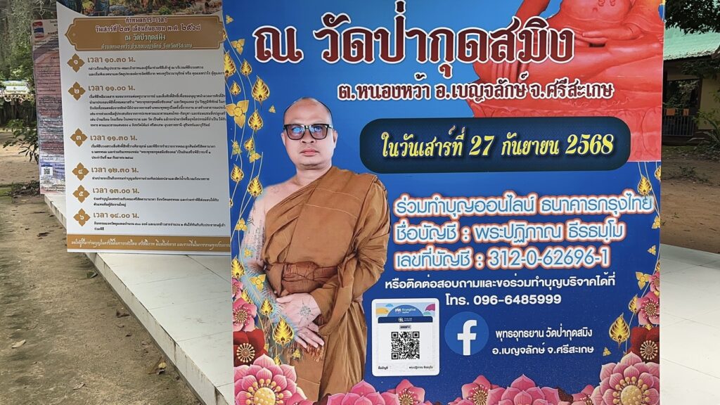 พระครูปิยวนารักษ์ กล่าวเชิญชวนญาติโยม ว่า เจริญพรญาติโยมทุกคน ในวันที่ 27 กันยายน 2568 ที่ วัดป่ากุดสมิง ตำบลหนองหว้า อำเภอเบ็ญจลักษ์ จังหวัดศรีสะเกษ จะมีพิธีเททองหล่อ พระพุทธรูปกรุตสมิงชัยมงคล เพื่อเป็นสิริมงคล เพื่อนำไปประดิษฐาน ไว้ตามแนวชายแดน และอีกส่วนหนึ่ง ก็ได้รับการถวายลูกกระสุนปืนใหญ่ ปืนเล็ก เอ็ม16 มาประกอบพิธีพลีมวลสาร เป็นพระผงกรุตสมิงชัยมงคล รุ่น ปิตุภูมิพิทักษ์ เพื่อนำไปมอบให้ เป็นขวัญกำลังใจกับทหารกล้าตามแนวชายแดนไทย – กัมพูชา ทั้ง 4 จังหวัด พร้อมกับญาติโยม ทั้งหลายที่สนใจ ศรัทธา จึงขอเชิญชวนญาติ – โยม ทุกท่าน มาร่วมเททองหล่อพระ ด้วยกัน วันเสาร์ที่ 27 กันยายน เริ่มเวลา 09.09 น.กับพิธีบวงสรวง พิธีเททองหล่อพระ รำถวายองค์พญานาค ปล่อยปลาลงกุดสมิง แจกทานข้าวสาร และมอบโลงศพให้มูลนิธิกู้ภัยฯ ตำบลจานใหญ่ เพื่อมอบต่อให้กับศพไร้ญาติต่อไป