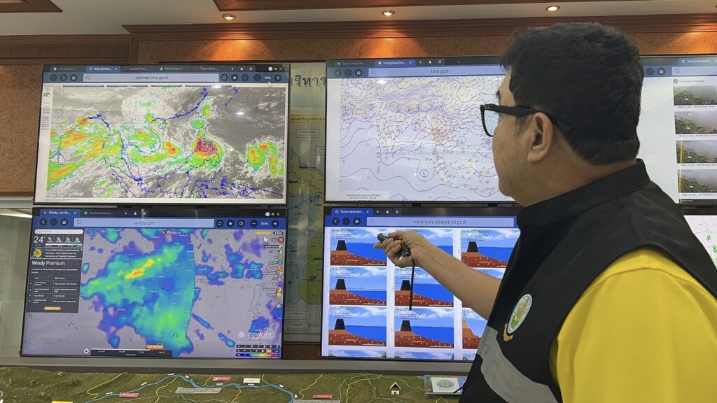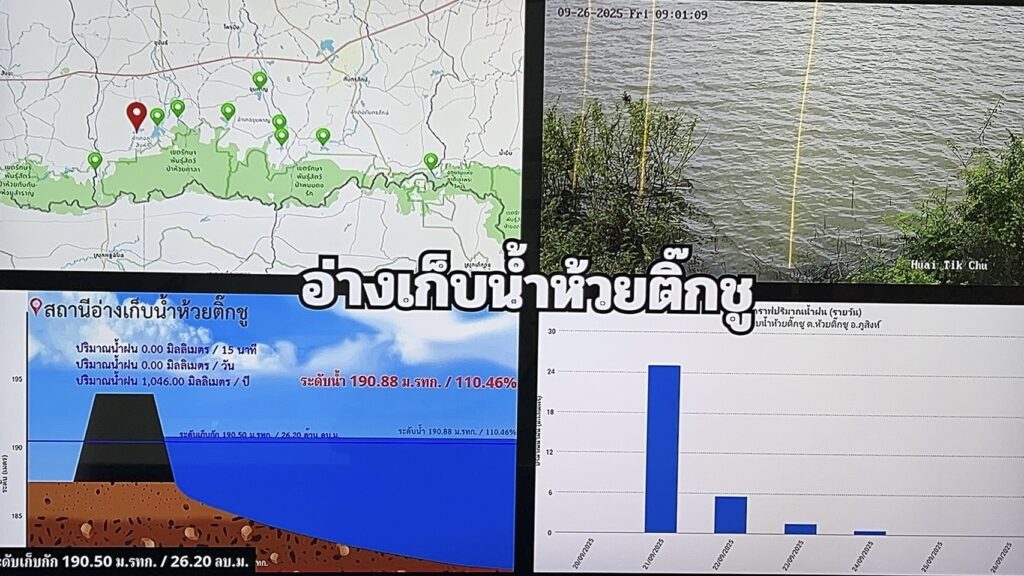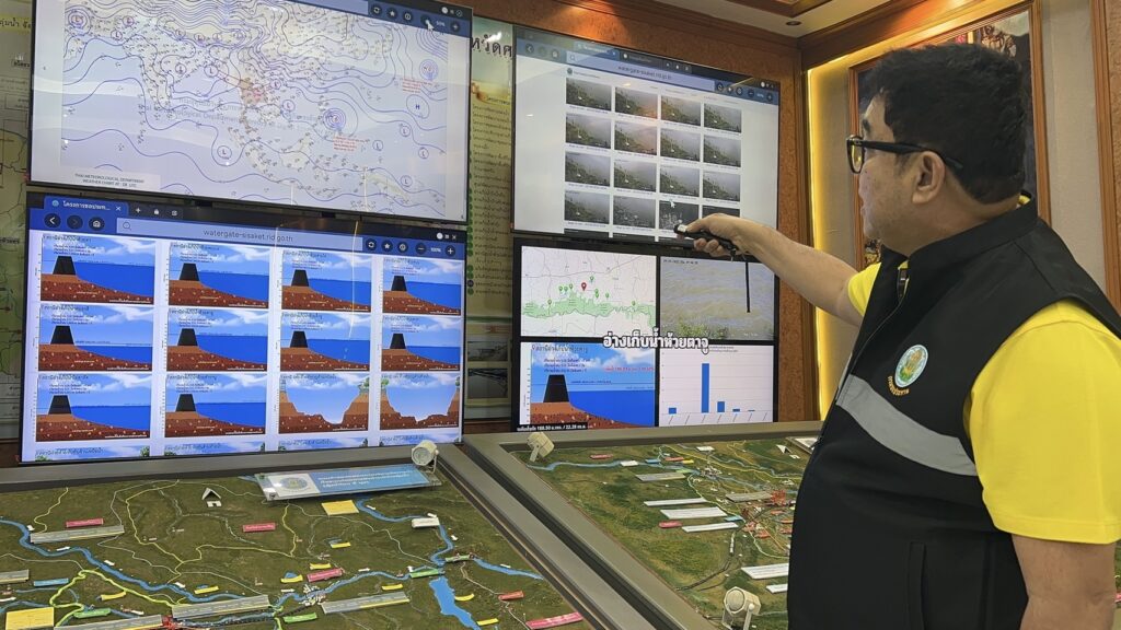 นายจำรัส สวนจันทร์ ชลประทานจังหวัดศรีสะเกษ ได้นำชมระบบการติดตามปริมาณน้ำ ในอ่างเก็บน้ำทั้ง 12 แห่ง กับ 2 เขื่อน ที่มีภาพจากกล้องวงจรปิด ที่สามารถติดตาม ประเมิน เฝ้าติดตามสถานการณ์น้ำในทุกจุดได้ตลอดแบบนาทีต่อนาที โดยชี้แจงประกอบภาพ ว่า ตอนนี้ปริมาณน้ำที่ ลงมาจากเทือกเขาพนมดงรักล้นสปริงเวย์ ซึ่งเป็นผลจากพายุกาลาซ่า และต่อไปก็จะเป็นพายุบัวลอย ตอนนี้อยู่ที่ประเทศฟิลิปปินส์ คาดว่าจะเข้าเวียดนาม อีก 2 วันซึ่งอีสาน ที่จะต้องเฝ้าระวังอย่างต่อเนื่อง และเฝ้าติดตามกรมอุตุนิยมวิทยา ส่วนกลุ่มเมฆในพื้นที่จังหวัดศรีสะเกษ วันนี้ มีฝนตกในเขตอำเภอราศีไศล และกระจายมาในอำเภอเมืองศรีสะเกษ และชายแดนบางส่วน ตอนนี้เรากำลังเฝ้าติดตามมรสุม ที่จะส่งผลกระทบกีบจังหวัดศรีสะเกษ ก็คือ จากพายุวิภา ที่จะเข้าสู่ประเทศไทย ขณะที่ตอนนี้ 12 อ่างมีปริมาณน้ำที่เกินจุดเก็บกักจาก 16 อ่างล้นแล้ว