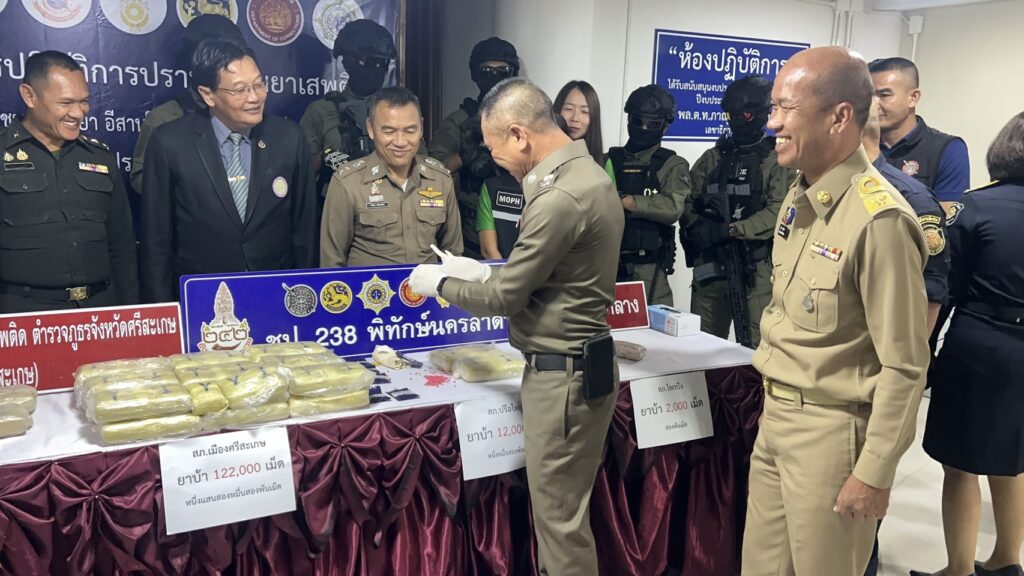 ต่อมาในวันที่ 13 ตุลาคม 2568 จากการขยายผล มาพบ 2 สามีภรรยา จอดรถยนต์แท็กซี่ เพื่อเติมน้ำมันที่ปั้มน้ำมัน ปตท. บ้านเพียนาม ตำบลหนองไผ่ อำเภอเมืองศรีสะเกษ ขอตรวจค้นรถแท็กซี่ พบยาเสพติดชนิดยาบ้า จำนวน 122,000 เม็ด ตรวจยึดพร้อมรถยนต์แท็กซี่ ไว้สอบสวนดำเนินคดี และที่อำเภอโนนคูณ เจ้าหน้าปกครองอำเภอโนนคูณ เข้าตรวจสอบรถจักรยานยนต์ใหญ่ที่ต้องสงสัย และตรวจภายในบ้าน พบยาเสพติด ชนิดยาบ้า จำนวน 2 พันเม็ด สรุปรวบรวมคดี สามารถตรวจยึดของกลาง ยาเสพติด ชนิดยาบ้า ได้รวม 190,000 เม็ด ยึดทรัพย์สิน รถยนต์กระบะ และรถยนต์เก๋งแท็กซี่ ได้ รวม 2 คน มูลค่า 920,000.- บาท ควบคุมผู้ต้องหาได้ 4 ราย และเตรียมได้ออกหมายจับเพิ่มอีก 7 ราย คาดว่าจะได้ตัวในเร็วๆ นี้