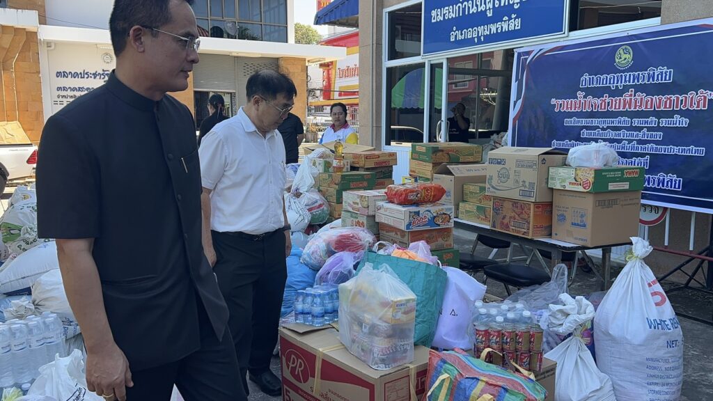 ขณะเดียวกันที่ ปกครองอำเภอ ทั้ง 22 อำเภอ ก็ได้เปิดรับสิ่งของ เครื่องใช้ ในการรวมน้ำใจเพื่อซับน้ำตาชาวใต้ เหมือนกันกับที่อำเภออุทุมพรพิสัย จังหวัดศรีสะเกษ นาย พศิน ทาศิริ นายอำเภออุทุมพรพิสัย และ นายสมพงษ์ จิริวิภากร นายกเทศมนตรี เทศบาลตำบลกำแพง เป็นหัวเรือใหญ่ในการเปิดรับสิ่งของเครื่องใช้ และที่ชาวบ้าน นำมามอบให้มากที่สุดก็เห็นจะเป็น ข้าวสาร เพราะชาวอีสาน ทำนา ปลูกข้าว จึงได้นำข้าวสารมามอบให้มากที่สุด ขณะนี้มีมากกว่า 10 ตันแล้ว ซึ่งจะได้ลำเลียงโดยรถยนต์ขนส่ง รถบรรทุกใหญ่ ส่งไปในวันพรุ่งนี้ก่อน พร้อมกับข้าวของอื่นๆ ที่ได้รับบริจาคมา ซึ่งตอนนี้เชื่อน่าจะเต็มรถบรรทุก 10 ล้อแล้ว มากกว่า 5 คัน เฉพาะในอำเภออุทุมพรพิสัย ตอนนี้ วันนี้