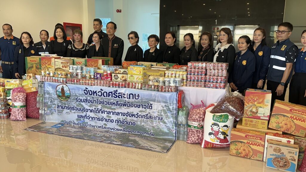 จังหวัดศรีสะเกษ รวมน้ำใจซับน้ำตาชาวใต้ เปิดรับบริจาคสิ่งของเครื่องใช้ที่จำเป็น ข้าวสาร อาหารแห้ง พริก – หอม – กระเทียม ยารักษาโรค แป้งนาคา ผ้าอนามัย น้ำดื่ม รวบรวมทั้งที่ ปภ.จังหวัด และปกครองอำเภอ- จังหวัด ทั้ง 22 อำเภอ คุณแม่โฆษกรัฐบาล นำชมรมแม่ดีเด่นแห่งชาติ ร่วมมอบเงินสด