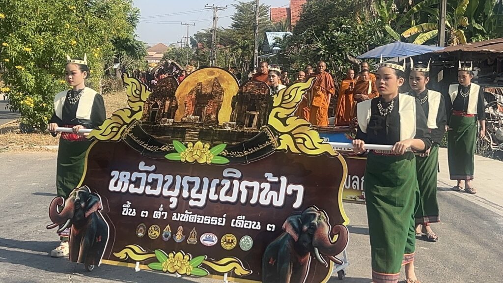 ชาวบ้านใน 17 ตำบล ในอำเภอปรางค์กู่ ได้เตรียมเครื่องเซ่นไหว้ตามประเพณี ลงในเกวียน เข้าขบวนแห่เครื่องเซ่นไหว้ จากบริเวณหน้าวัดกู่ ไปสู่ปรางปราสาทปรางค์กู่ 3 หลัง ที่เป็นปราสาทขอมโบราณสมัย พระเจ้าสุริยะวรมัน สมัยเรืองอำนาจ ได้แผ่อิทธิพล การปกครองไปอย่างกว้างขวาง ในแถบเอเชียในปัจจุบัน ที่จะปรากฎร่องรอยของการที่มีปรางค์ปราสาทขอม กระจายไปทั่วแผ่นดินขอม สมัยนั้น