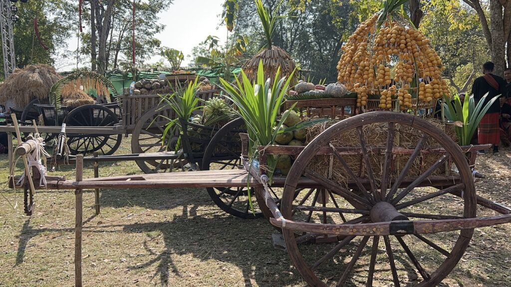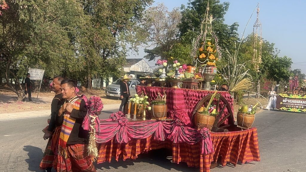 ขบวนแห่เครื่องเซ่นไหว้ ได้ดำเนินตามราชประเพณี ขอมโบราณ ทั้งข้าว ปลา อาหาร ผลไม้มงคล และที่สำคัญ ต้องมีคือ น้ำจัน ที่ปัจจุบัน ก็คือ เหล้าสาโท ที่ทำจากข้าวหมัก กรองเอาน้ำมาดื่ม และถือเป็นสำคัญในการนำมาเป็นเครื่องเซ่นสังเวย นอกจากอาหาร คาวหวาน โภชนาการต่างๆ นำมาวางล้อมรอบตัวปรางปราสาท ก่อนที่พ่อพรามหณ์จะเริ่มร่ายเวช ประกอบพิธี ถวายเครื่องเซ่นไหว้ เชิญเทพ เทวา ลงมาเสวย และเมื่อได้เวลาอันสำควร ก็จะกล่าวลาเครื่องเซ่นไหว้ นำไปให้ลูกหลาน คนในครอบครัว ได้บริโภค ดื่มกิน ถือเป็นอาหารทิพย์มงคล พร้อมกับการขอพร บรรดาลให้ข้าวน้ำอุดมสมบูรณ์ ในการประกอบอาชีพ ในฤดูกาลผลิตปีต่อๆ ไป ขณะเดียวกัน ภายในงานนี้ ยังได้มีชาวบ้าน ได้นำผลผลิตจากชุมชน มาออกร้าน เปิดแสดงโชว์ และจำหน่ายให้นักท่องเที่ยว ที่มาเที่ยวงานเป็นจำนวนมาก ด้วย