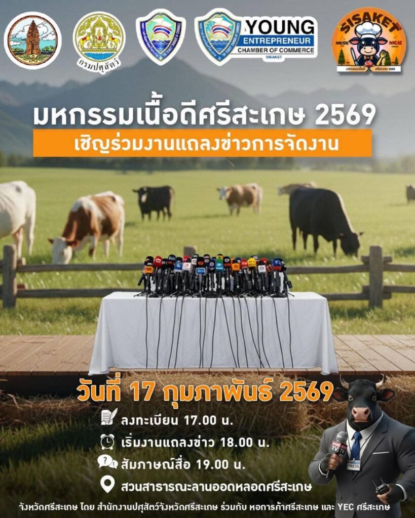 รูปแบบใหม่ ภายใต้แนวคิด “Less for More” (ทำน้อยได้มาก เน้นคุณภาพ) ดัน “โคเนื้อเกรดพรีเมียม” สู่ตลาดมูลค่าสูง สร้างรายได้ที่มั่นคงและยั่งยืนให้เศรษฐกิจฐานราก ยุทธศาสตร์ “Less for More” สู่คุณภาพชีวิตที่ดีกว่า จังหวัดศรีสะเกษมุ่งเปลี่ยนผ่านการทำปศุสัตว์จากที่เน้นปริมาณ สู่การผลิตแบบ “ทำน้อยแต่ได้มูลค่าสูง” โดยเน้นคุณภาพ นวัตกรรม และความยั่งยืน ช่วยลดต้นทุน ลดผลกระทบต่อสิ่งแวดล้อม และยกระดับคุณภาพชีวิตเกษตรกรตามหลัก BCG Model ภายใต้สโลแกน “เนื้อดีศรีสะเกษ: ศิลปะที่กินได้ จากความใส่ใจของเกษตรกรไทย สู่มาตรฐานสากล”เทศกาลสำหรับสายเนื้อและเสียงดนตรี งานมหกรรมเนื้อดีศรีสะเกษฯ เป็นพื้นที่จัดแสดงศักยภาพของเกษตรกรและผู้ประกอบการท้องถิ่น ผู้ร่วมงานจะได้ดื่มด่ำกับบรรยากาศสุดชิล ชิมเมเนเนื้อพรีเมียมจากเชฟและร้านอาหารชื่อดัง พร้อมเพลิดเพลินกับเสียงดนตรีตลอดงาน ถือเป็นการกระตุ้นเศรษฐกิจและการท่องเที่ยวของจังหวัดอย่างเป็นรูปธรรม ชูจุดแข็งสายพันธุ์พรีเมียมและมาตรฐานความปลอดภัย