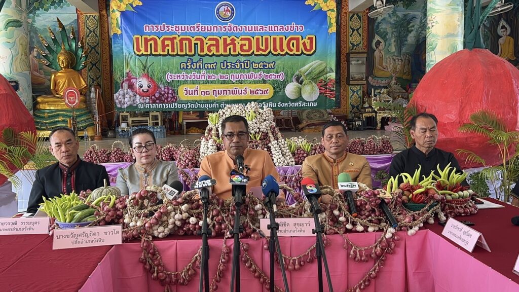 นาย ลิขิต สุขเยาว์ นายอำเภอวังหิน แถลงข่าว ว่า ขอเชิญเที่ยวงามเทศกาลหอมแดงบ้านขุมคำ ตำบลบุสูง อำเภอวังหิน จังหวัดศรีสะเกษ ซึ่งครั้งนี้เป็นการจัดครั้งที่ 39 ระหว่างวันที่ 26 – 28 กุมภาพันธ์ 2569 ณ.วัดบ้านขุมคำ ตำบลบุสูง อำเภอวังหิน จังหวัดศรีสะเกษ เป็นที่ทราบทั่งกันว่า จังหวัดศรีสะเกษ เป็นแหล่งปลูกหอมแดงขนาดใหญ่ มีพื้นที่ปลูกหอมแดง ที่นี้รวมกันมากกว่า ร้อยละ 70% ของไทย โดยพาะอำเภอวังหิน ถือว่าเป็นแหล่งผลิตหอมแดงที่มีคุณภาพ เป็นที่ยอมรับของผู้บริโภค มีการสั่งไปจำหน่าย ทั้งภายในประเทศ และส่งออกไปยังต่างประเทศ ซึ่งมีพื้นที่เพาะปลูกหอมแดง ราว 1,000 ไร่ มีผลผลิตในแต่ละปี ราว 3,600 ตัน ซึ่งหอมแดงอำเภอวังหินจะมีคูณลักษณะที่โดดเด่น ที่คุณภาพดี ไม่เหมือนใคร คือ มีหัวขนาดใหญ่ มีความแห้ง แดง มัน คอเล็ก เก็บไว้ได้นาน โดยเกษตรกรในอำเภอวังหิน จะใช้พื้นที่หลังฤดูทำนา เป็นพื้นที่มาปลูกหอมแดง ราว 200 ไร่ มีผลผลิตในแต่ละปี ราว 600 ตัน สามารถสร้างรายได้ให้เกษตรกร ราวปีละ 12 ล้านบาท โดยการจัดงาน เพื่อส่งเสริมการท่องเที่ยว และเพิ่มรายได้ ให้กับเกษตรกร เป็นการเปิดตัวหอมแดงขุมคำ ให้ผู้บริโภครู้จัด ว่า หอมแดงขุมคำ คุณดีเป็นเช่นไร จึงขอเชิญนักท่องเที่ยว มาเที่ยวงาน มารู้จักขุมคำ