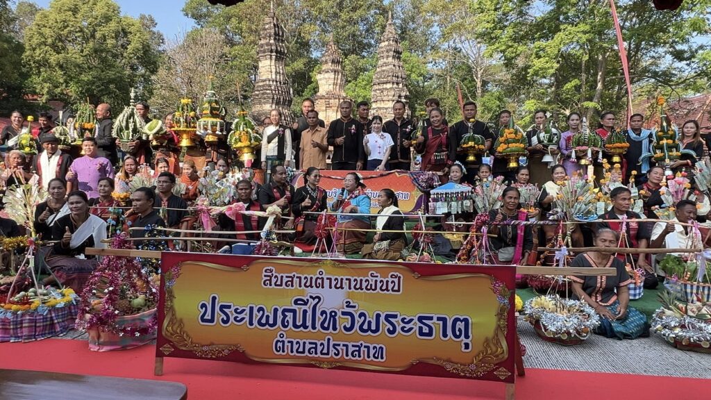 วันที่ 3 มีนาคม 2569 ขึ้น 15 ค่ำ เดือน 3 เนื่องในวัน มาฆบูชา ชาวตำบลปราสาท หามแห่ข้าวจี่ มาไหว้บรรพบุรุษ ณ ปราสาทบ้านปราสาท อำเภอห้วยทับทัน จังหวัดศรีสะเกษ ตำนานปราสาทพันปี ประเพณีไหว้ปราสาท โครงกระดูกบรรพบุรุษ ทับหลัง ดินแดนแห่งประวัติศาสตร์ ของชนเผ่ากูย นับตั้งแต่พบเจอปราสาท ตรงนี้ ก่อนได้มาตั้งบ้านเรือน สืบเชื้อสายของชนเผ่ากูย มาโดยตลอด และถือประเพณีการทำข้าวจี่สอดใส่ไส้น้ำอ้อย หาบใส้ตะกร้า กระบุง นำมาประกอบพิธีไหว้ขอขมาโครงกระดูกของบรรพบุรุณ ณ ปราสาทบ้านปราสาท เป็นประจำทุกปี ในวันขึ้น 15 ค่ำ เดือน 3 และสืบต่อเนื่องมาโดยตลอด ในการแต่งชุดชนเผ่ากูย มาแห่หาบข้าวจี่รอบปราสาท 3 ปรางค์ ที่ตั้งอยู่บนแผ่นศิลาแผ่นเดียวกัน ก่อนนำไปตั้งถวายหน้าปราสาท และประกอบพิธีถวายภัตราหารเพล แด่พระภิกษุสงฆ์ ที่อยู่ภายในวัดบ้านปราสาท แห่งนี้
