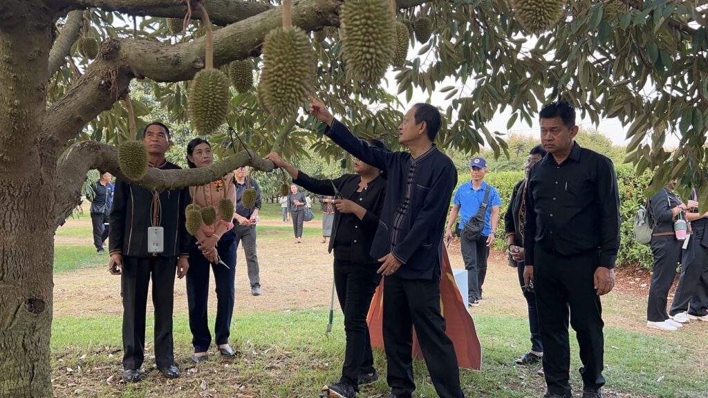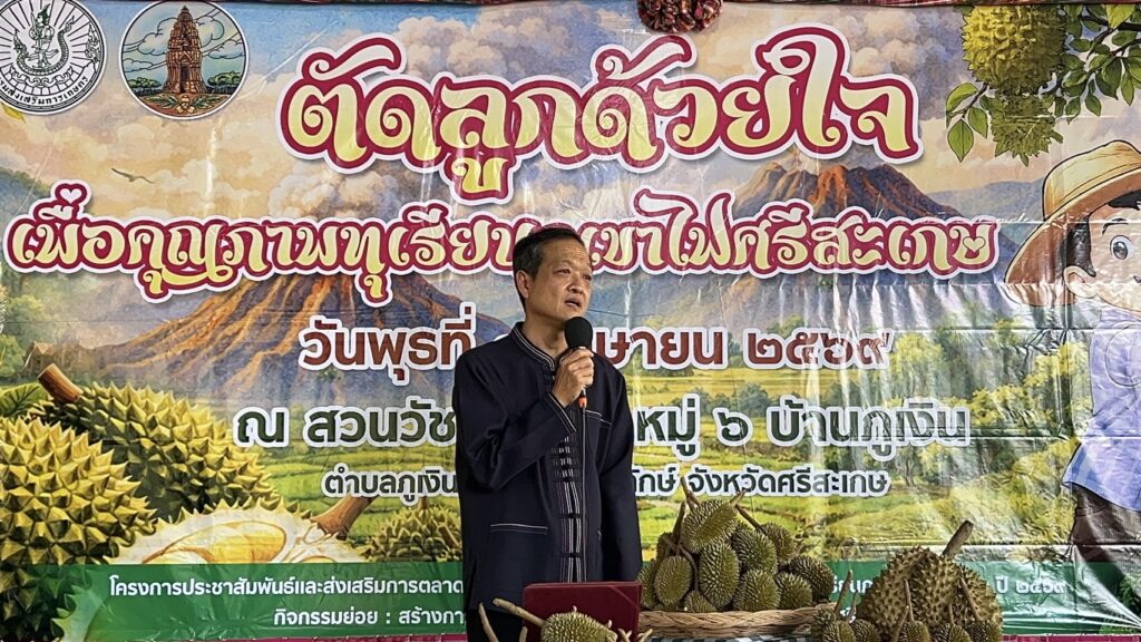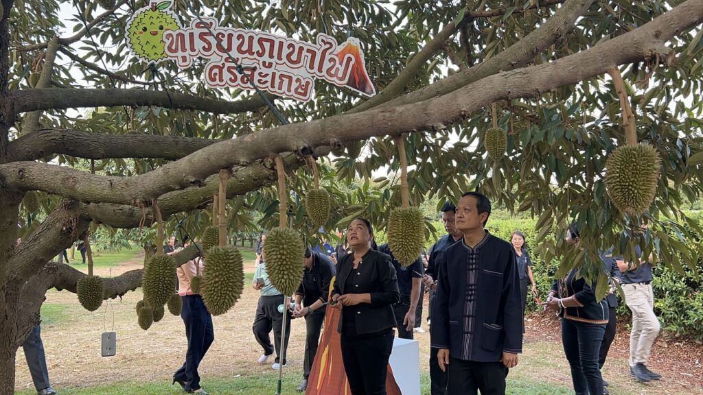 โดย นาย อนุรัตน์ ธรรมประจำจิต ผู้ว่าราชการจังหวัดศรีสะเกษ กล่าวว่า สวนที่เรามาดูวันนี้ เป็นสวนที่คุณภาพมาก เพราะผ่านได้รับตรารับรองมาตรฐาน GAP และ มาตรฐาน GI เป็นการบริหารจัดสวนอย่างดี ซึ่งไม่ใช่แค่ระบบ แต่ตัวเกษตรกรได้ใส่ใจคุณภาพ ที่อยากจะปลูกทุเรียนที่คุณภาพ ที่อร่อย ให้กับผู้บริโภค ที่เปรี่ยมด้วยคุณภาพพร้อมเสิร์ฟแก่ทุกคน และราคาก็จะบ่งบอกถึงคุณภาพ จึงอยากฝากถึงผู้บริโภค ทุเรียนภูเขาไฟศรีสะเกษ ไม่ใช่แค่ทุเรียนธรรมดา แต่เป็นทุเรียนที่เต็มเปรี่ยมไปด้วยหัวใจของเกษตรกร ที่พร้อมจะเสิร์ฟทุเรียนที่อร่อยมากๆ ให้กับผู้บริโภคทั่วประเทศไทย ซึ่งปีนี้ทุเรียนภูเขาไฟศรีสะเกษ จะมีหลายรุ่น เริ่มจากปลายเดือนเมษายน 2569 นี้ บางสวนเริ่มสุกแก่จัด ออกสู่ตลาดแล้ว และก็จะทยอยอออกไปเรื่อย ในเดือนพฤษภาคม – มิถุนายน – กรกฎาคม จนถึงต้นเดือน สิงหาคม 2569 ทำให้แนวโน้มด้านราคาจะดีตลอด เพราะไม่ออกพร้อมกันเยอะๆ และช่วงที่มากที่สุดก็คือ เดือนมิถุนายน และมีคุณภาพที่ดีมากด้วย