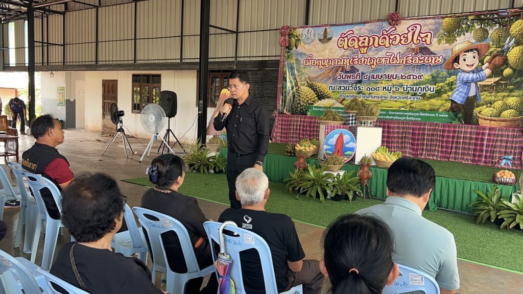 เย็นของวันที่ 8 เมษายน 2569 ที่ สวนวัชระทุเรียนภูเขาไฟ ตำบลภูเงิน อำเภอกันทรลักษ์ จังหวัดศรีสะเกษ โดย นายไกรศรี อินสุขศรี เจ้าของสวน ซึ่งวันนี้ได้มี นาย อนุรัตน์ ธรรมประจำจิต ผู้ว่าราชการจังหวัดศรีสะเกษ พร้อมด้วย นาย สุชาติ กลิ่นทองหลาง เกษตรจังหวัดศรีสะเกษ พร้อมด้วยหัวหน้าส่วนราชการในจังหวัด เกษตรอำเภอกันทรลักษ์ เกษตรกรชาวสวนทุเรียนในอำเภอกันทรลักษ์ ได้ร่วมกันนั่งรถจักรยานยนต์พ่วงข้าง หรือ ชาวบ้านเรียก รถซาเล็ง นำเข้าชมสวนทุเรียน 800 ไร่ ที่มีการบริหาร จัดการสวนที่สะอาด เป็นระเบียบ สวยงาม สามารถเปิดให้นักท่องเที่ยวเชิงเกษตร มาเที่ยวชมฟรีได้ เพราะขณะนี้ ลูกทุเรียนภูเขาไฟ กำลังติดลูก ขนาดเท่ากับกำปั้นของผู้ใหญ่แล้ว และอีกราว ต้นเดือนมิถุนายน 2569 นี้ ก็จะได้ครบกำหนดอายุในการเก็บ ซึ่งสวนนี้ ในปีที่ผ่านมา สามารถจำหน่ายขึ้นตู้บรรทุก ส่งออกไปจำหน่ายยังต่างประเทศ ได้มูลค่า กว่า 30 ล้านบาท ในการประมูลได้ราคาเพียงกิโลกรัมละ 105.-บาท จากจำนวน 1 ต้น ได้เก็บเลี้ยงลูกไว้ ต้นละ 50 ลูกเท่านั้น ด้วยการตัดลูก ตบแต่ง ส่วนเกินออก เพื่อไม่ให้แย่งอาหารกันเอง จึงได้ลูกที่สม่ำเสมอ ลูกสวย ซึ่งวันนี้ ผู้ว่าราชการจังหวัดศรีสะเกษ ได้มาชม และมาเรียนรู้ ในการตัดลูกทุเรียนส่วนเกินออก หรือที่ชาวสวนเรียน “ตัดลูกด้วยใจ เพื่อพัฒนาคุณภาพทุเรียนภูเขาไฟศรีสะเกษ” เมื่อได้ลูกทุเรียนภูเขาไฟศรีสะเกษพรีเมี่ยมแล้ว ก็สามารถกำหนดราคาจำหน่ายได้ โดยในปีนี้กำหนดไว้ เบื้องต้น ขั้นต่ำ กิโลกรัมละ 160 – 180.-บาท พร้อมเตรียมเสิร์ฟทุเรียนภูเขาไฟพร้อมทาน ถึงบ้านสำหรับ FC ทุเรียนภูเขาไฟศรีสะเกษ ทั่วประเทศ