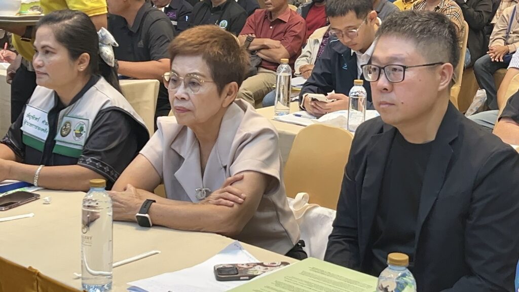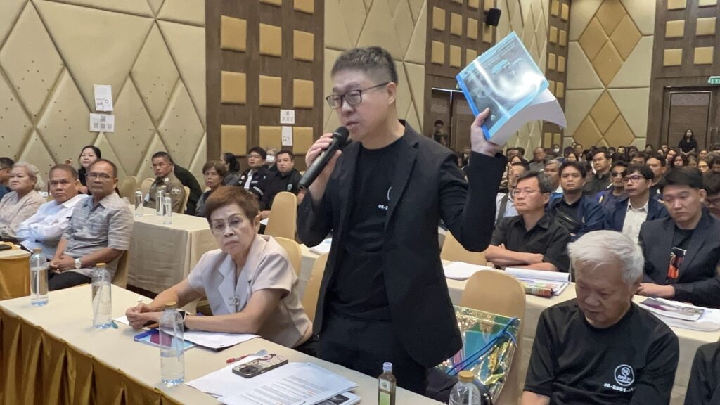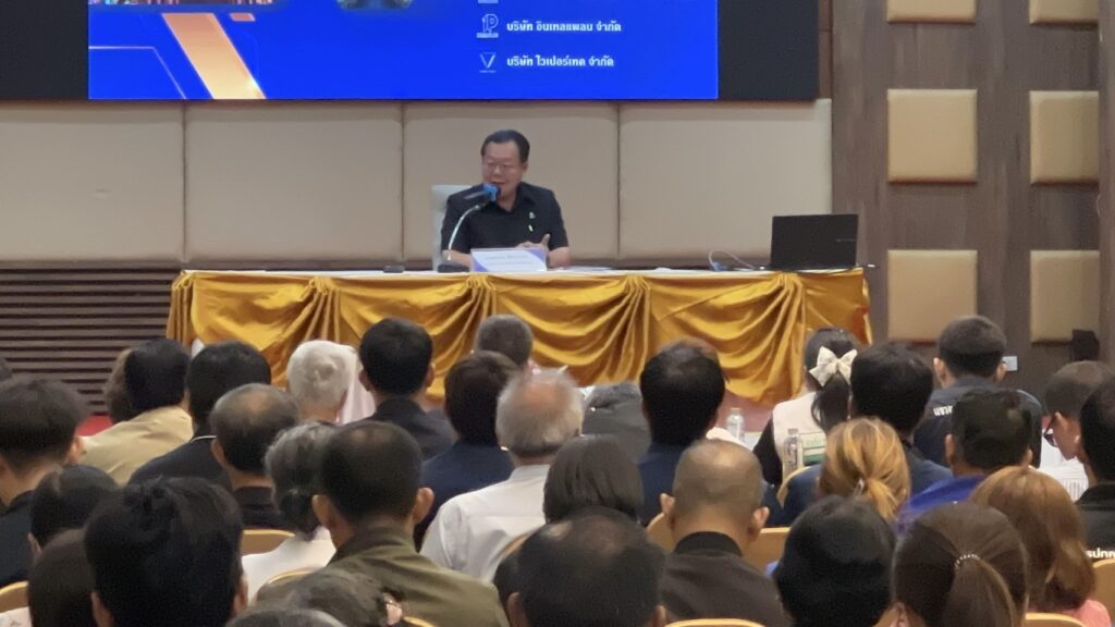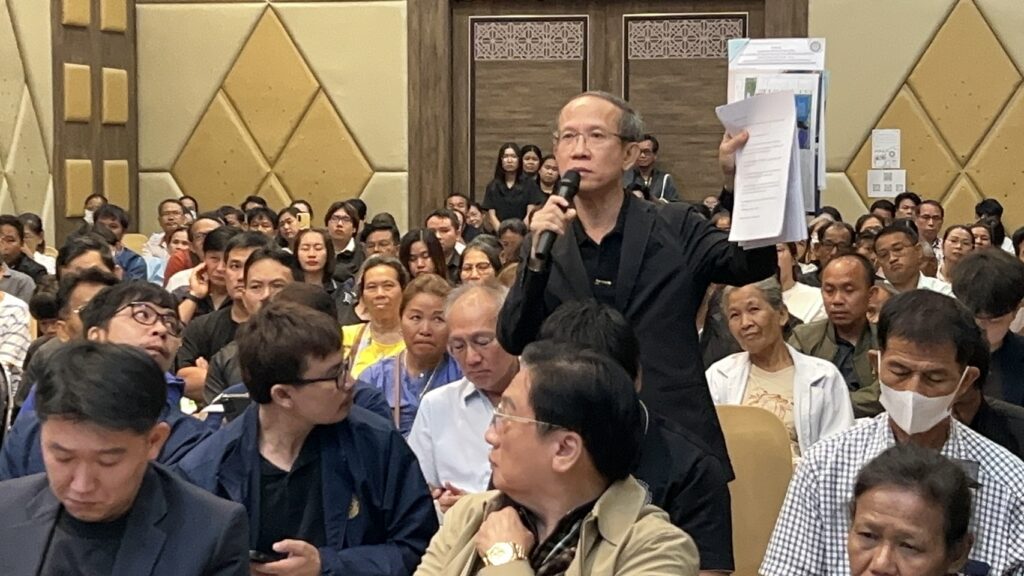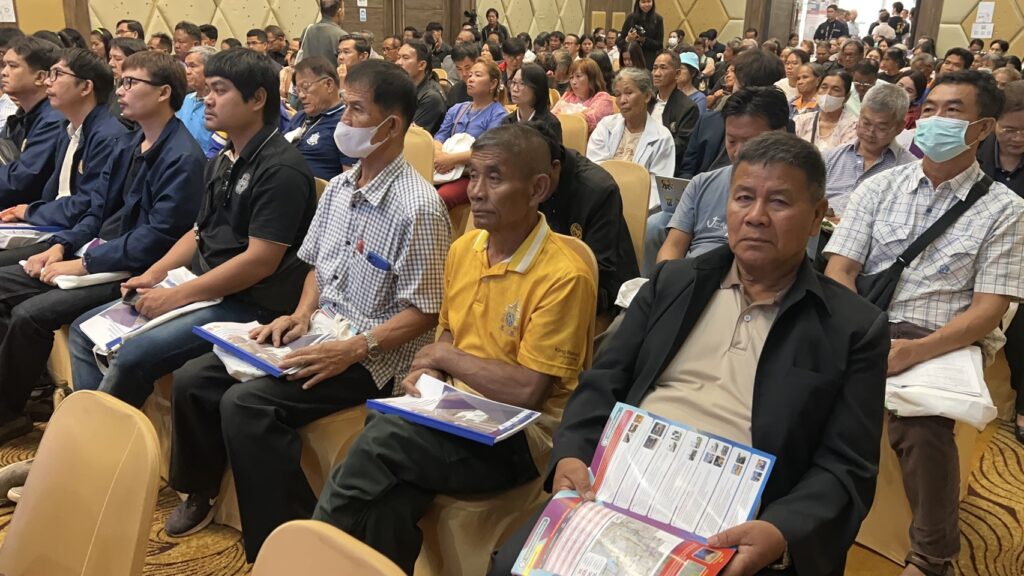 เวทีในการประชุม หาข้อสรุป ของบริษัทผู้ออกแบบ ก่อสร้างทางเลี่ยงเมืองศรีสะเกษ วงแหวนรอบนอก ฝั่งทิศตะวันออก 8 กม.งบประมาณ 2,500 ล้านบาท ประชาชนผู้ที่ถูกผลกระทบ ต้องเวนคืนที่ ต่างไม่เห็นด้วย