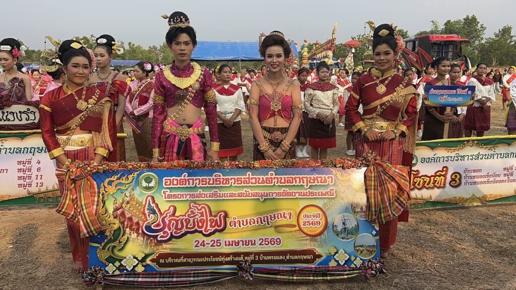 วันที่ 24 เมษายน 2569 ที่ ทุ่งกว้างสาธารณะ บ้านพรหมแสง ตำบลกฤษณา อำเภอขุขันธ์ จังหวัดศรีสะเกษ นาย วันชัย ศรีบุญเรือง นายก อบต.กฤษณา ร่วมกับ สมาชิกสภาฯ อบต., สภาวัฒนธรรมตำบลกฤษณา, เจ้าหน้าที่ – พนักงาน อบต., ผู้นำท้องที่ – ท้องถิ่น พี่น้องประชาชน ในเขตตำบลกฤษณา ได้ร่วมกันจัดงาน ประเพณีงานบุญบั้งไฟ ประจำปี 2569 โดยมีหมู่บ้านที่รวมตัวกันเป็นโซน เป็นเขต จำนวน 4 โซน จาก จำนวน 13 หมู่บ้าน จัดขบวนแห่เซิ้ง ขบวนฟ้อนรำ และการละเล่นแบบโบราณ ดั่งเดิม ของพื้นถิ่นคนอีสาน มานำเสนอเพื่อขอฝน และเรียกคะแนนจากคณะกรรมการผู้ตัดสินขบวนฟ้อนรำ ในวันเปิดงานในครั้งนี้