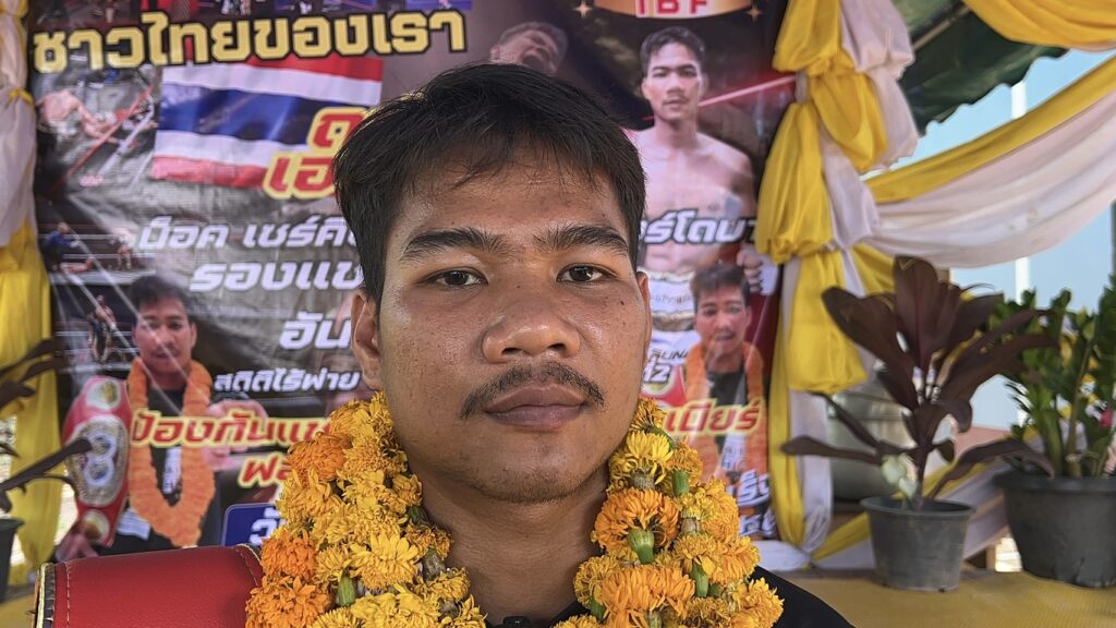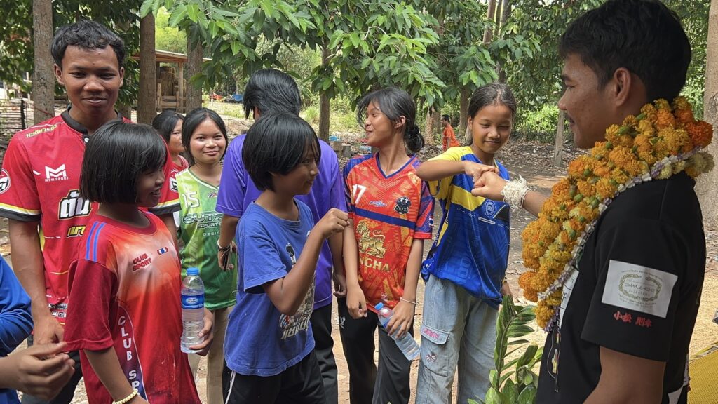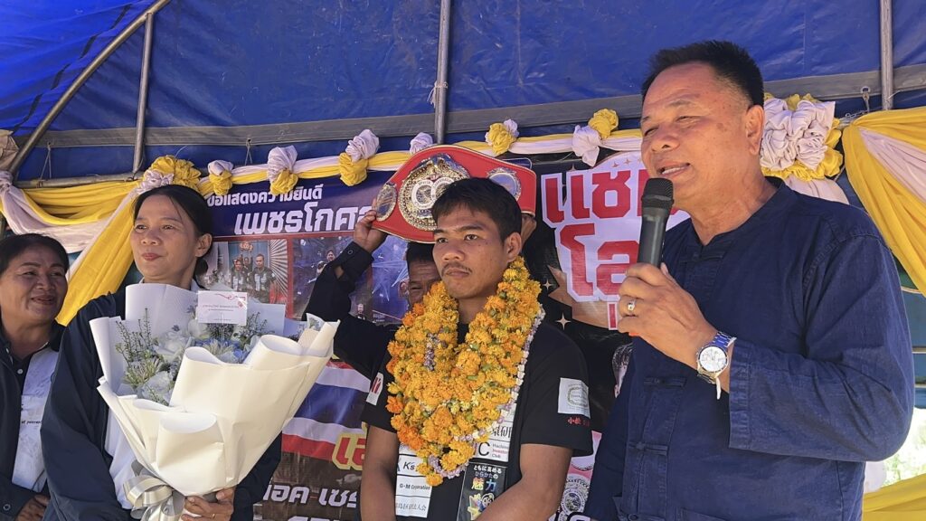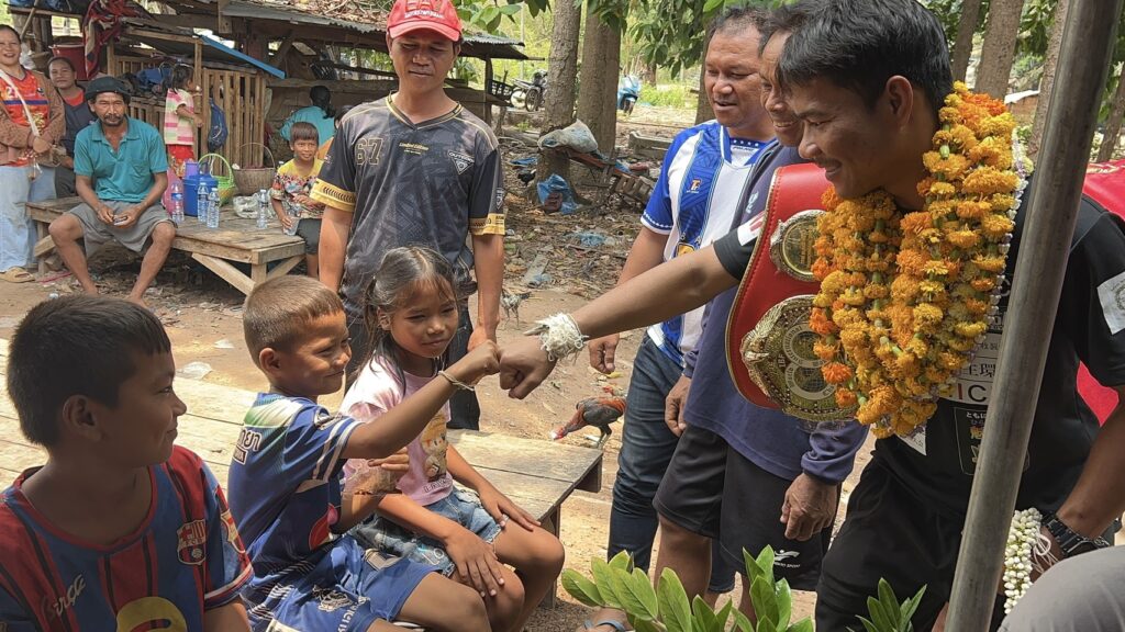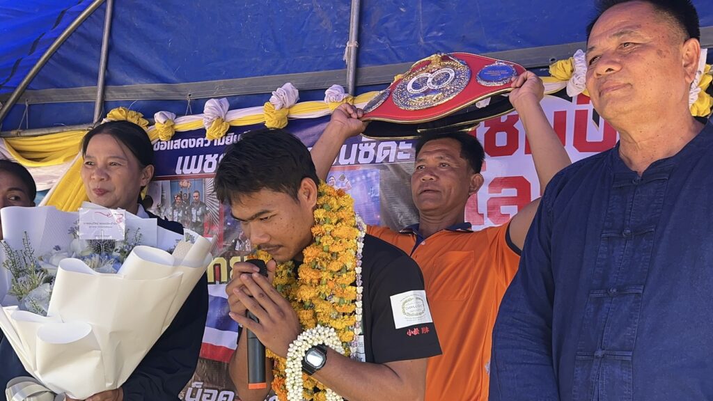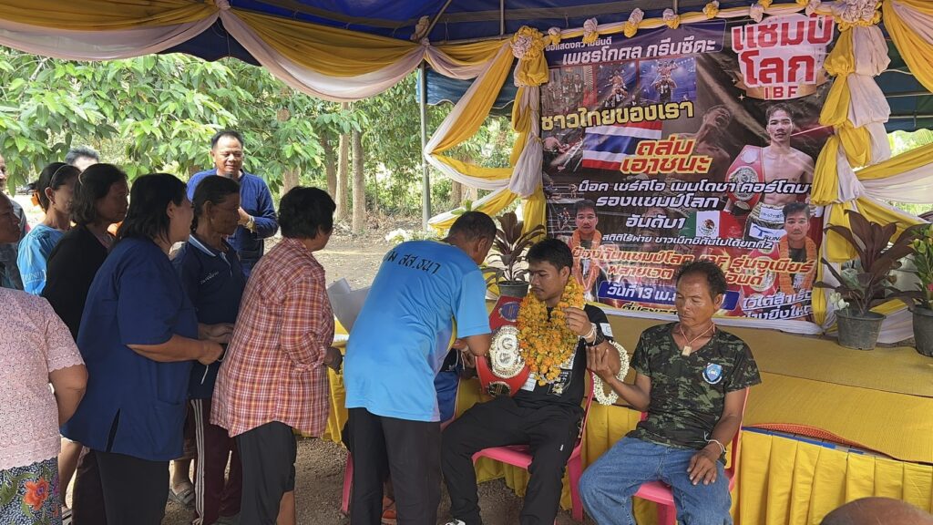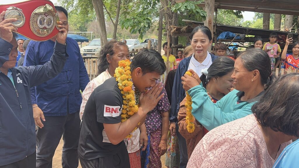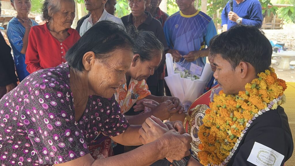 ชาวบ้านตูม อำเภอศรีรัตนะ จังหวัดศรีสะเกษ แห่มาร่วมแสดงความยินดี ผูกแขน เรียกรับขวัญ กับ เจ้าสน แชมป์โลก สหพันธ์มวยนานาชาติ IBF รุ่นไลต์ฟลายเวต 108 ปอนด์ ที่ประเทศญี่ปุ่น เมื่อ 13 เมษายน 2569