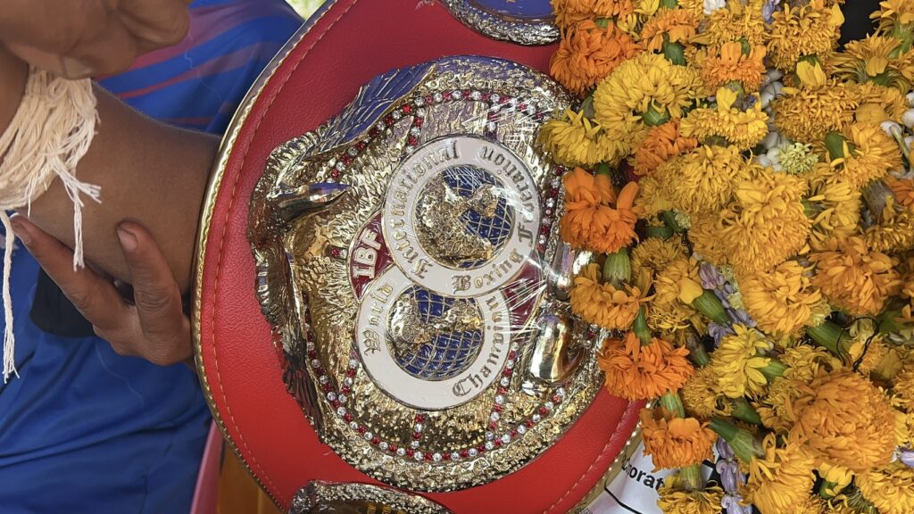 ขณะที่ เจ้าสน แชปม์โลก IBF ให้สัมภาษณ์ ว่า ( ช่วงแรกพูดเป็นภาษาส่วย ) และแปลออกมาเป็นภาษาไทย ได้ว่า ขอบคุณที่พี่น้องชาวบ้านตูม จากบ้านหนองกันจง มารอให้กำลังใจ และขอขอบคุณนายก อบต.ตูม ขอบคุณไปยัง ท่าน ผู้ว่าราชการจังหวัดศรีสะเกษ ที่ได้มอบหมายให้ท่านปลัดอำเภอ เป็นผู้แทน มามอบช่อดอกไม้ แสดงความยินดีให้ในวันนี้ ซึ่งในการชกครั้งที่ผ่านมา ตนต้องเตรียมตัวหนักมาก เพราะคู่ต่อสู้ค่อนข้างแข็งแรง ได้เปรียบตนมาก ทั้งยาวกว่า สูงกว่า ตนจึงต้องฝึกหนัก รับฟัง และทำตามโค้ชตลอด จนวันชก 13 เมษายน 2569 ในยกที่ 2 พอได้โอกาสตนก็สามารถน๊อคคู่ต่อสู้ได้ และตอนนี้ก็มีแชมป์ รอชกอยู่อีก 2 คน ก็จะพยายามเชื่อฟังโค็ช และต่อสู้เพื่อคนไทย และครอบครัวต่อไป